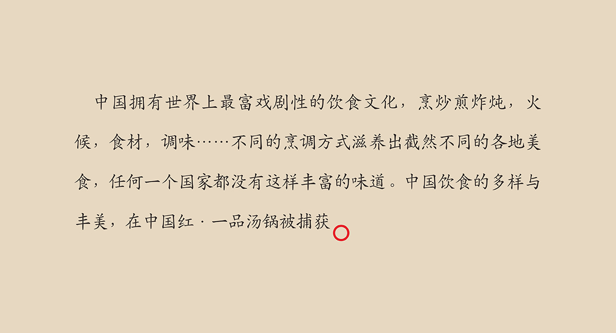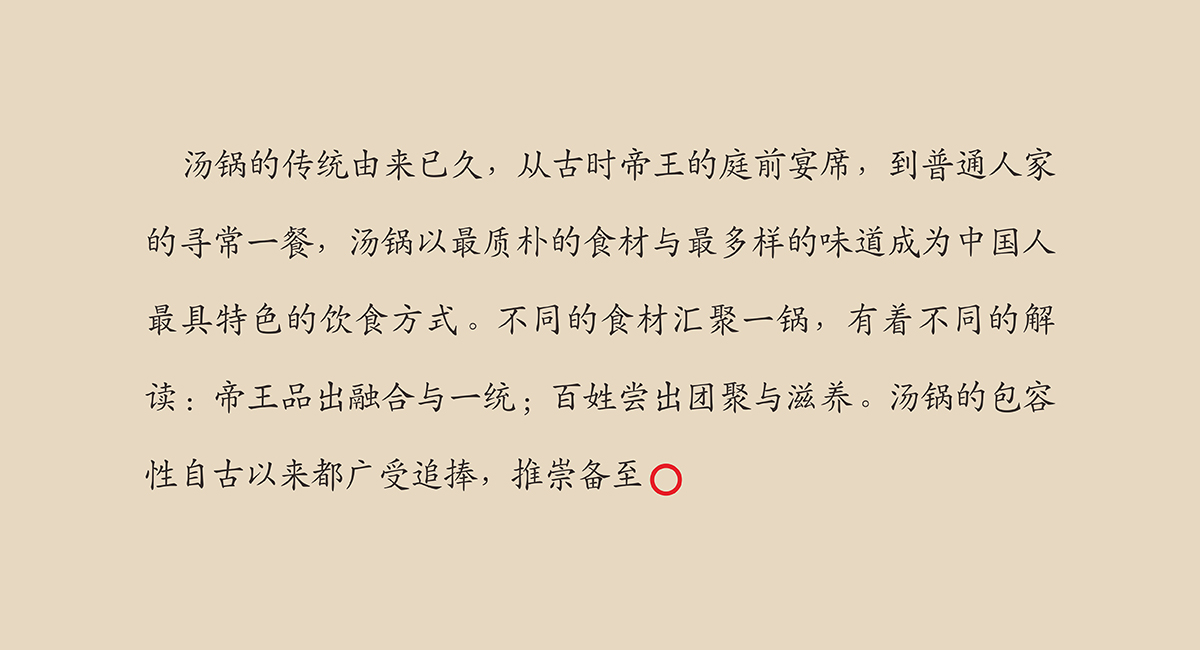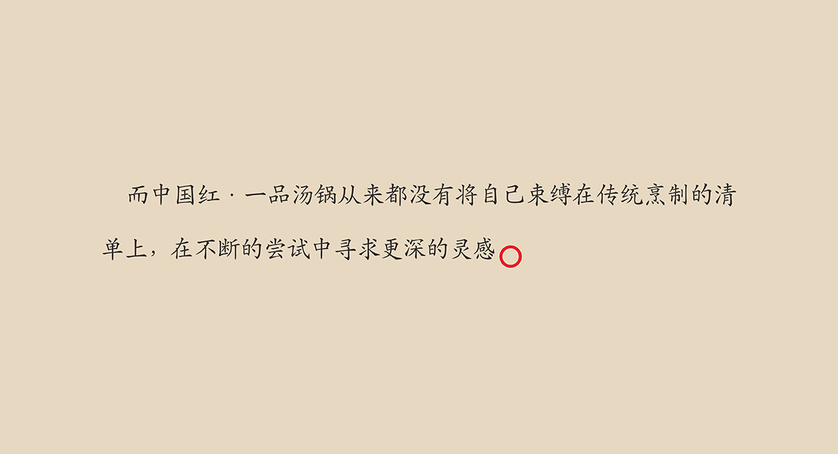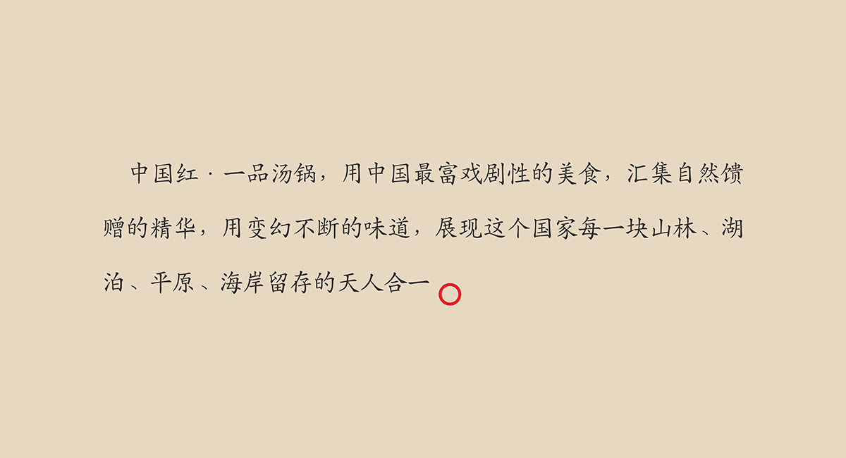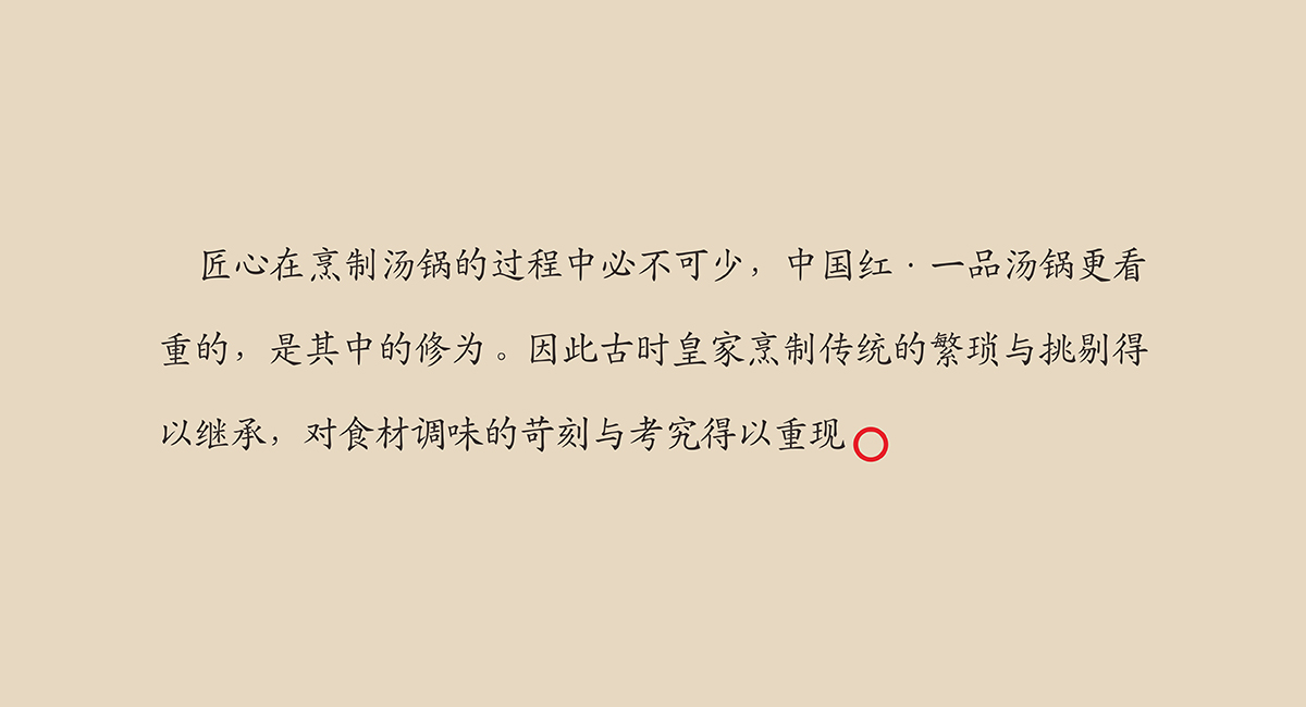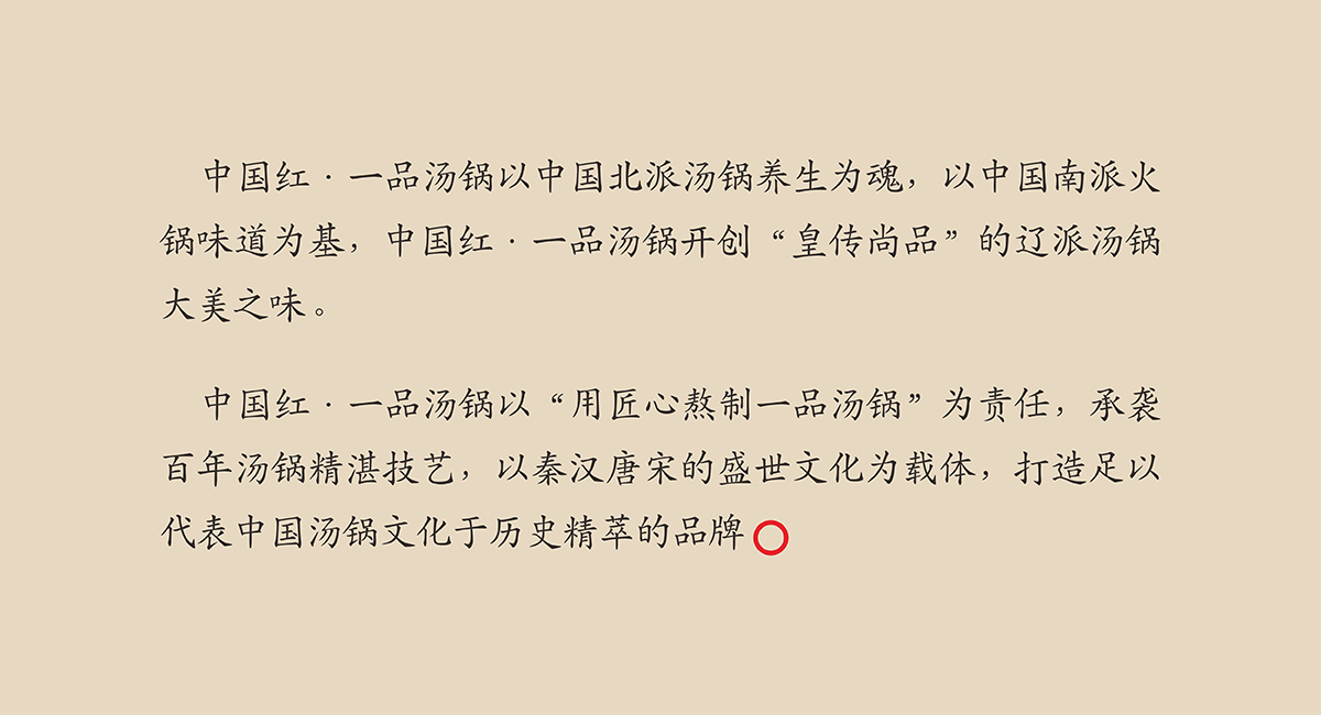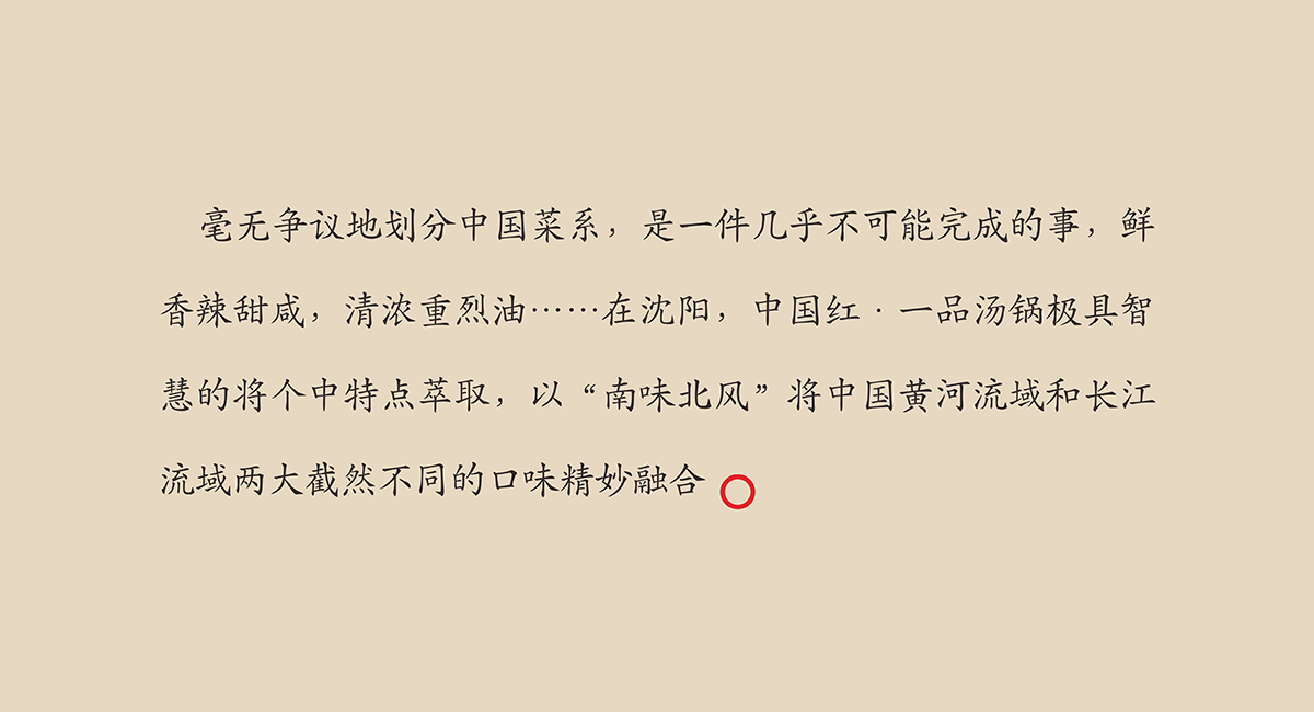 中國紅·一品湯鍋是沈陽中國紅餐飲打造的高端湯鍋品牌。產品以中國北派湯鍋養生為魂,中國南派火鍋味道為基,中國紅·一品湯鍋開創“皇傳尚品”的遼派湯鍋大美之味。成都九一堂商業空間設計用文化提升消費體驗, 中國紅·一品湯鍋以“用匠心熬制一品湯鍋”為責任,承襲百年湯鍋精湛技藝,以秦漢唐宋的盛世文化為載體,打造足以代表中國湯鍋文化于歷史精萃的品牌。 中國擁有世界上最富戲劇性的飲食文化,烹炒煎炸燉,火候,食材,調味……不同的烹調方式滋養出截然不同的各地美食,任何一個國家都沒有這樣豐富的味道。中國飲食的多樣與豐美,在中國紅·一品湯鍋被捕獲。 湯鍋的傳統由來已久,從古時帝王的庭前宴席,到普通人家的尋常一餐,湯鍋以最質樸的食材與最多樣的味道成為中國人最具特色的飲食方式。不同的食材匯聚一鍋,有著不同的解讀:帝王品出融合與一統;百姓嘗出團聚與滋養。湯鍋的包容性自古以來都廣受追捧,推崇備至。 而中國紅·一品湯鍋從來都沒有將自己束縛在傳統烹制的清單上,在不斷的嘗試中尋求更深的靈感。毫無爭議地劃分中國菜系,是一件幾乎不可能完成的事,鮮香辣甜咸,清濃重烈油……在沈陽,中國紅·一品湯鍋極具智慧的將個中特點萃取,以“南味北風”將中國黃河流域和長江流域兩大截然不同的口味精妙融合。匠心在烹制湯鍋的過程中必不可少,中國紅·一品湯鍋更看重的,則是其中的修為。因此古時皇家烹制傳統的繁瑣與挑剔得以繼承,對食材調味的苛刻與考究得以重現。每一味美食都是一種禮儀,需要用虔誠才能代代相傳。中國人就是這樣,用食材與味道,將數千年歷史中的文化故事,沉淀于每一個普通人的餐桌前。當我們細品、探尋、理解、思考其中的味覺之美時,一代代中國人對飲食文化的責任與技藝飽含其中。九一堂商業空間設計將歷史美學與背景融入互動體驗空間設計中,中國紅·一品湯鍋,用中國最富戲劇性的美食,匯集自然饋贈的精華,用變幻不斷的味道,展現這個國家每一塊山林、湖泊、平原、海岸留存的天人合一。