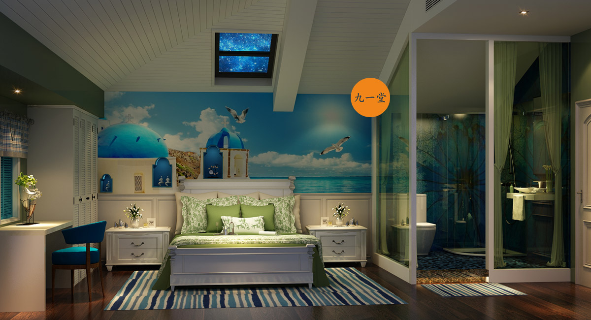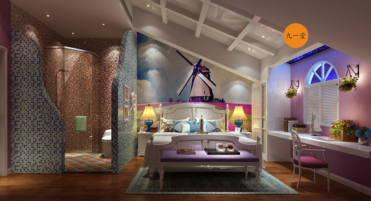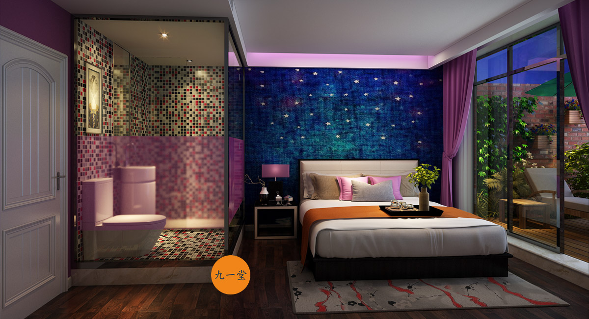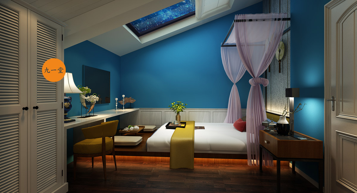 蘭亭星雨酒店,位于四川成都武侯區,本項目選址商業頂層,層高達到8米,推窗即見星空,這正是酒店的賣點與買點,成都九一堂設計充分利用建筑結構本身特點,將酒店空間作兩層處理,在一層的空間設計布局中將露臺分割到了每一個房間,讓之成為酒店配套花園,也加強了房間的亮點。在繁華的都市中去體驗一處度假別院的花園主題酒店實屬珍貴。在頂面如此復雜的坡屋頂中找到了靈感,合理的規劃了空間,在二樓每個房間中打開了一個天窗。在晴朗的夜空,還可以透過天窗看看夜空的星星,十分愜意,當“霾”籠罩大地時我帶你去領略漫天星海的凈空,這便是蘭亭星雨酒店的魅力所在,與眾不同,小而精致。九一堂設計在軟裝環節盡量做到簡潔與溫馨,讓每一個房間精致,時尚,舒適.在眾多主題酒店選擇中,蘭亭星雨酒店有著自己獨特的競爭力與優勢。