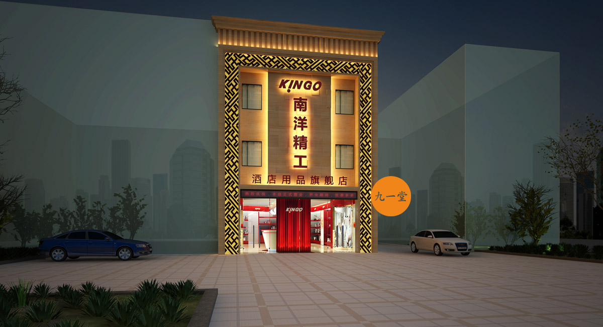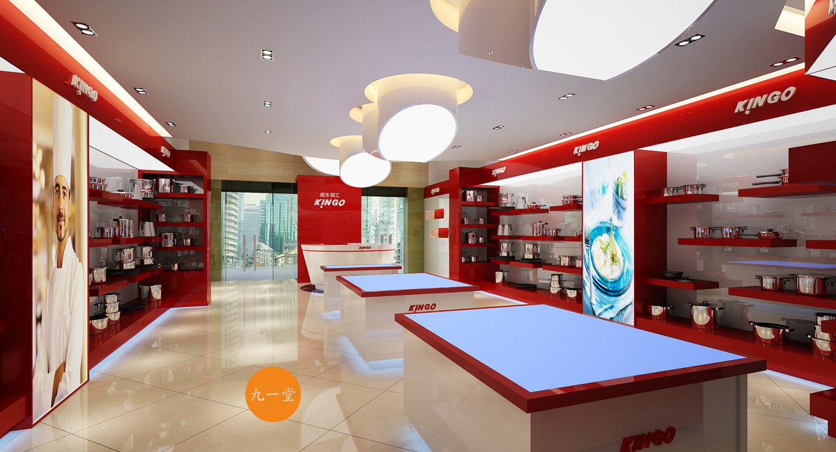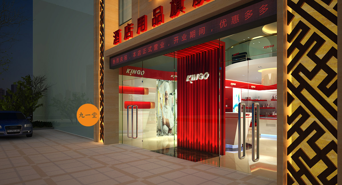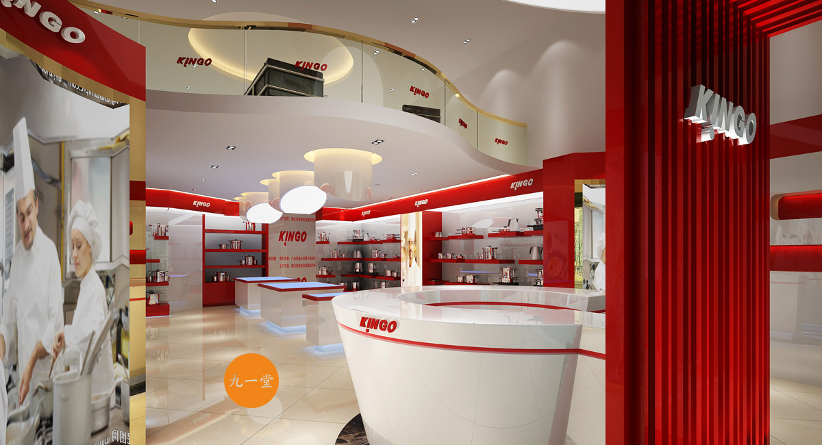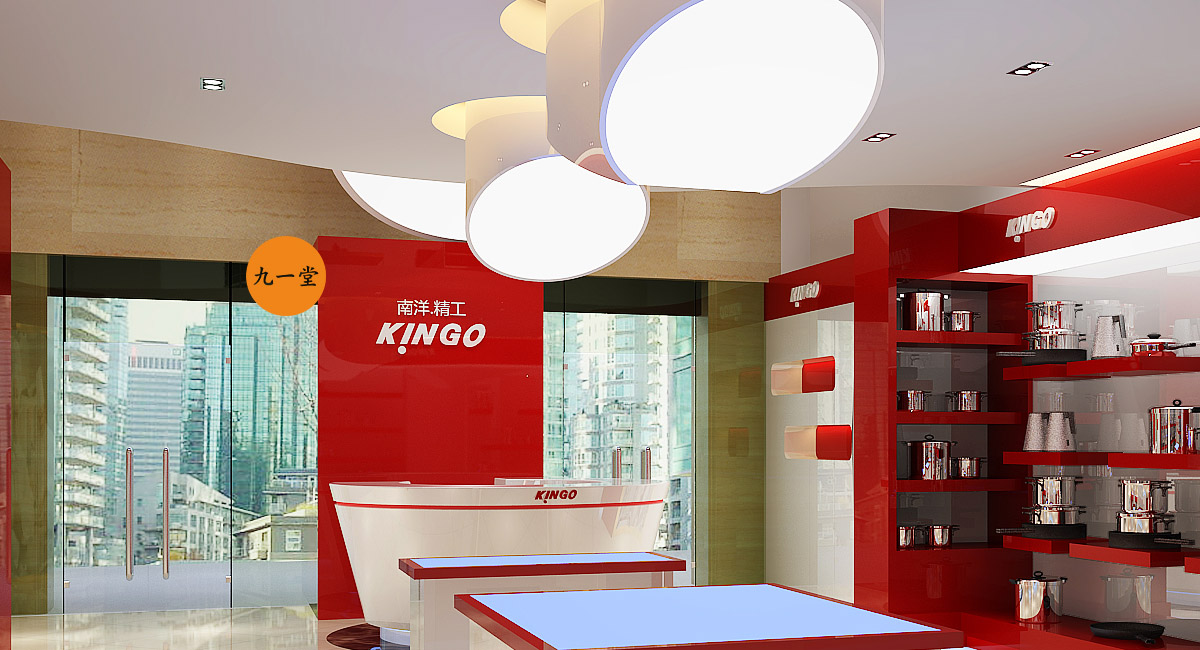 南洋精工是一家提供星級酒店設(shè)備用品的品牌公司,九一堂品牌設(shè)計對本案進(jìn)行研究討論后,決定以提升整個品牌氣質(zhì)為主,在色彩上加入流行色玫瑰金,把整個展廳的色彩比例調(diào)整為60%白色,35%紅色,5%金色。金色在整個品牌氣質(zhì)里起到了畫龍點睛的作用。而在整個展廳設(shè)計中,為了更好展示不銹鋼材質(zhì),巧妙用了展柜發(fā)光以及對展柜下面使用氛圍燈光的手法,室內(nèi)展柜材質(zhì)則多用亮面烤漆來表現(xiàn),增強(qiáng)與產(chǎn)品本色不銹鋼材質(zhì)的對比,更好的突出產(chǎn)品特質(zhì)。整個門頭則用米黃色石材,與星級酒店的大氣高品質(zhì)做呼應(yīng),體現(xiàn)南洋精工的品牌核心價值。