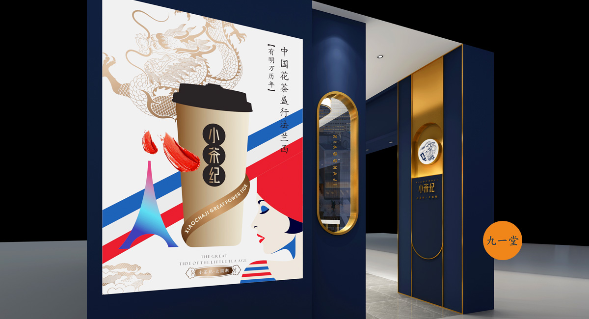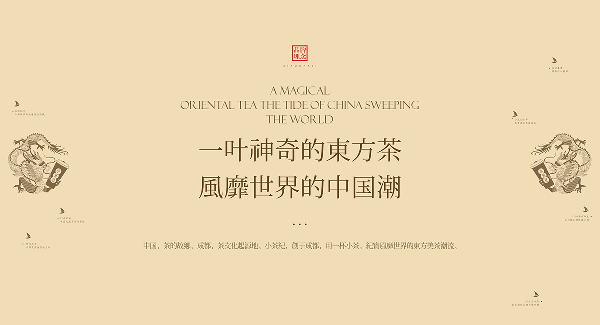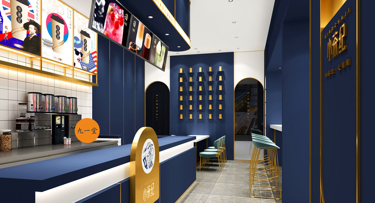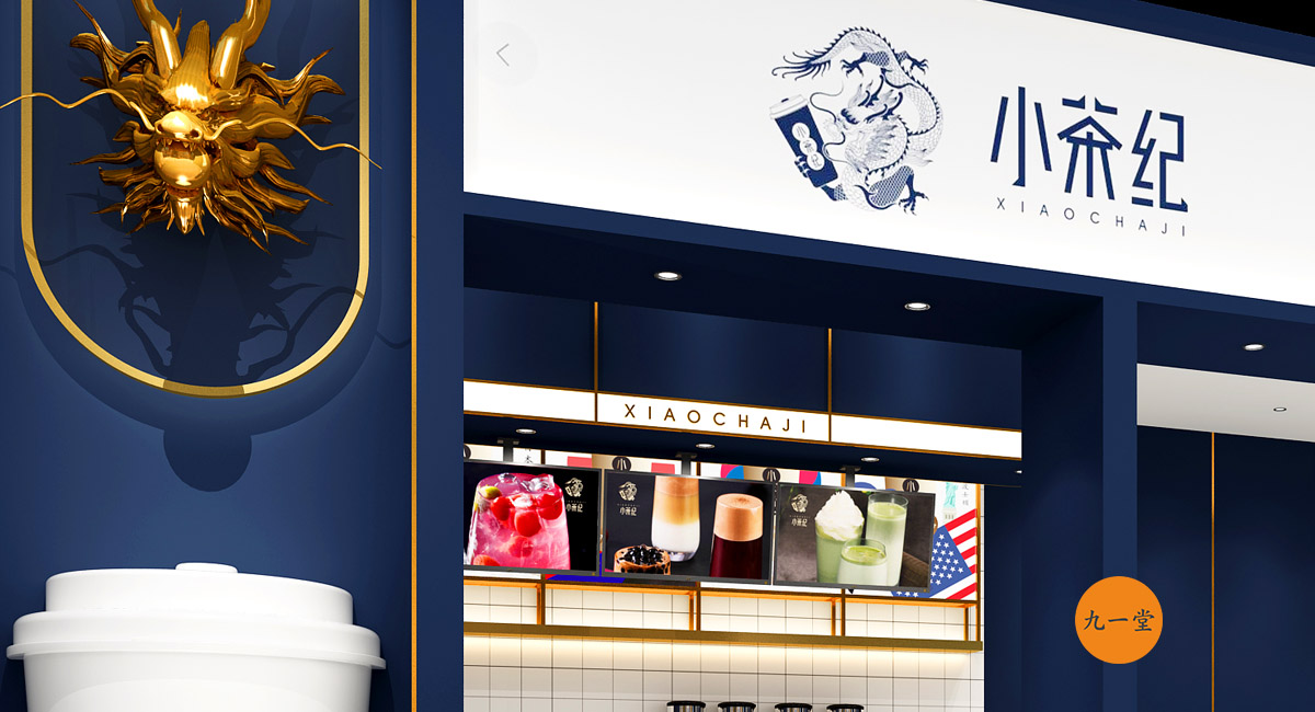 一葉神奇的東方樹葉,成為了風靡世界的中國潮。中國是茶的故鄉(xiāng),成都是茶文化的起源地。小茶紀,創(chuàng)建于成都,用一杯小茶紀成為風靡世界的東方美茶潮流。在小茶紀的空間設計上采用深藍和金色色調,體現(xiàn)小茶紀品牌的沉穩(wěn)的性格,但有沒有摒棄此品牌時尚的氣質,大面積鈦金的收邊提升了品牌整體品質。門頭的形象墻采用龍頭的設計契合項目的品牌定位,體現(xiàn)出大國的豪邁,白色杯子的運用使得整個空間時尚感十足。并且龍頭和杯子的運用在此空間中十分搶眼,是整個空間的點金之筆。